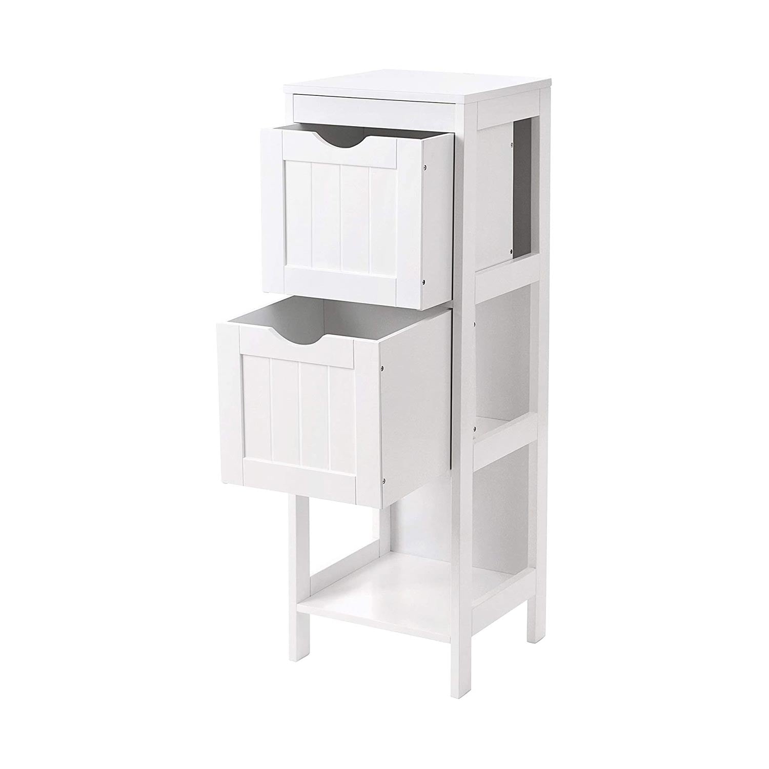 Fugtbestandigt materiale, også let at rengøre – badeværelsesskabet er fremstillet af MDF-plade (klasse E1), overfladebehandlet med lak, modstår fugt og skimmelsvamp og er let at rengøre.Tilpas din opbevaringsplads – Skufferne kan omplaceres efter ønske. D