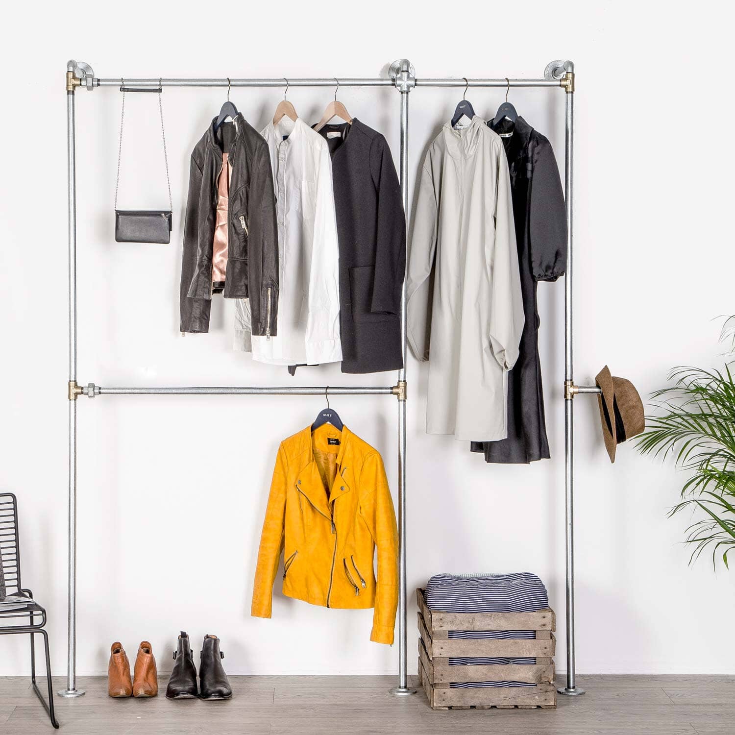 Kennedy tøjstativet minder om vores Alma tøjstativ, på nær at Kennedy tøjstativet er skruet fast i bagvæggen, og står solidt på sine 3 fødder på gulvet. Disse 3 fødder på gulvet skal naturligvis ikke skrues fast. Ingen af vores produkter skal skrues fast