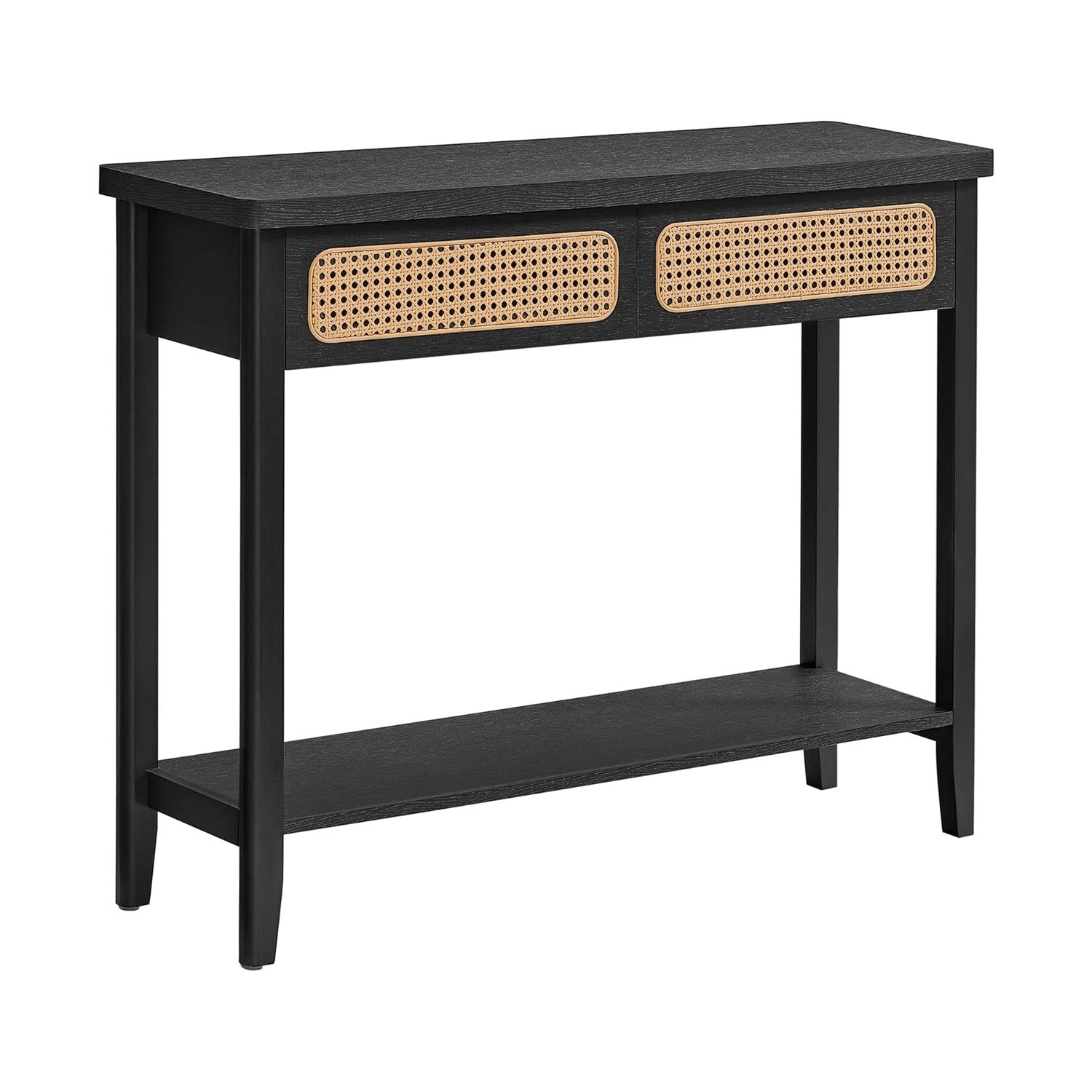 Boho-Inspireret Konsolbord med Moderne Elegance Løft Dit Hjem med Boho-Stil Dette konsolbord bringer et strejf af boho-charme ind i dit hjem. Den sorte nuance harmonerer smukt med naturlige elementer, og fronten af skuffen i PVC-rattan tilføjer en rig tek